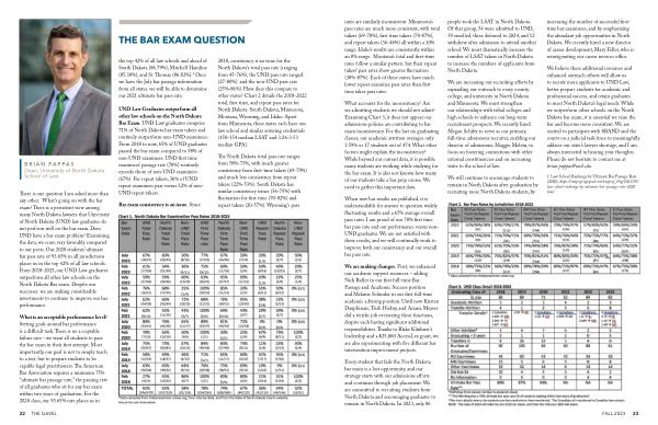 We believe these additional resources and enhanced outreach efforts will allow us to recruit more applicants to UND Law , better prepare students for academic and professional success , and retain graduates to meet North Dakota ’ s legal needs . While we outperform other schools on the North Dakota bar exam , it is essential we raise the bar and become more consistent . We are excited to participate with SBAND and the courts on a judicial task force to meaningfully address our state ’ s lawyer shortage , and I am always interested in hearing your thoughts . Please do not hesitate to contact me at brian . pappas @ und . edu .