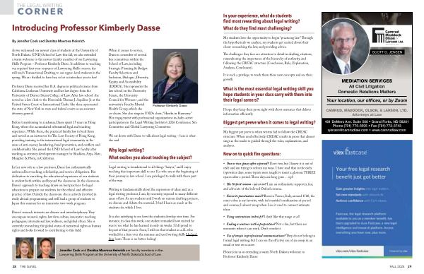 As we welcomed our newest class of students at the University of North Dakota ( UND ) School of Law this fall , we also extended a warm welcome to the newest faculty member of our Lawyering Skills Program – Professor Kimberly Dasse . In addition to teaching our required first-year sequence of Lawyering Skills courses , she will teach Transactional Drafting to our upper-level students in the spring . We are thrilled to have her , so let us introduce you to her !
