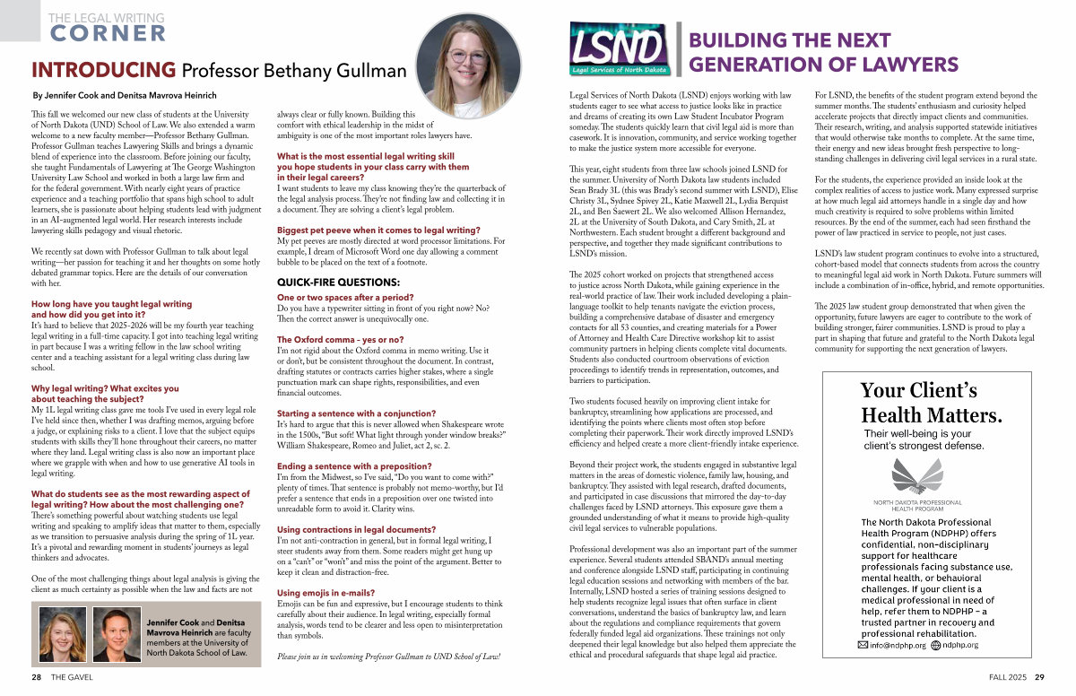 This fall we welcomed our new class of students at the University of North Dakota( UND) School of Law. We also extended a warm welcome to a new faculty member— Professor Bethany Gullman. Professor Gullman teaches Lawyering Skills and brings a dynamic blend of experience into the classroom. Before joining our faculty, she taught Fundamentals of Lawyering at The George Washington University Law School and worked in both a large law firm and for the federal government. With nearly eight years of practice experience and a teaching portfolio that spans high school to adult learners, she is passionate about helping students lead with judgment in an AI-augmented legal world. Her research interests include lawyering skills pedagogy and visual rhetoric.