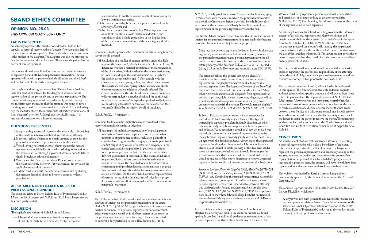 An attorney has been disciplined for failing to obtain the informed consent of co-personal representatives that were siblings and beneficiaries of their mother’ s estate. In re Disciplinary Action against Mcintee, 2013 N. D. 111,, 4, 833 N. W. 2d 431,432. In that case, the attorney prepared the mother’ s will, naming the co-personal representatives, and knew the mother included severe limitations on the use of the land they inherited. Id. The lawyer did not advise the co personal representatives they could hire their own attorney and had no fee agreement. Id. at, 15.