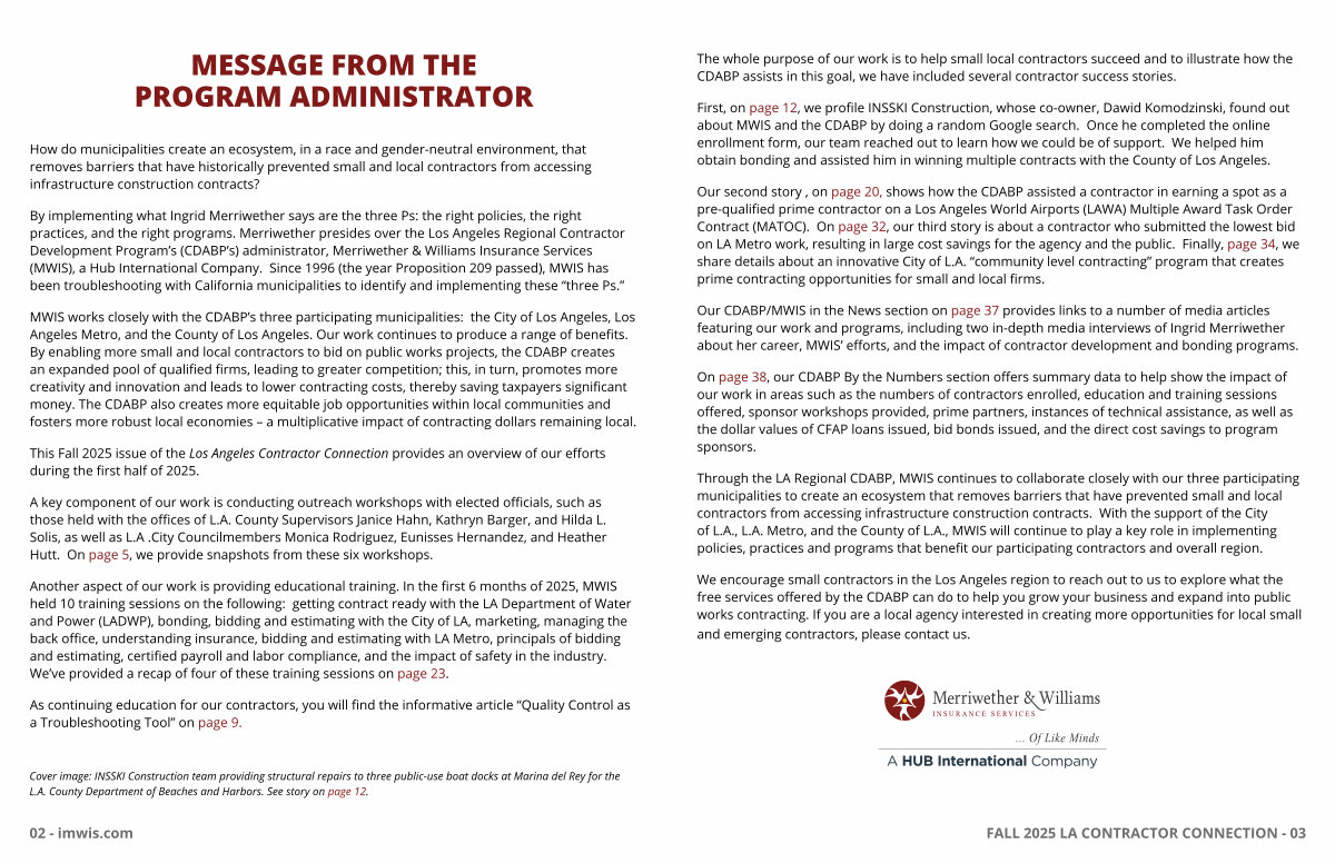 Another aspect of our work is providing educational training. In the first 6 months of 2025, MWIS held 10 training sessions on the following: getting contract ready with the LA Department of Water and Power( LADWP), bonding, bidding and estimating with the City of LA, marketing, managing the back office, understanding insurance, bidding and estimating with LA Metro, principals of bidding and estimating, certified payroll and labor compliance, and the impact of safety in the industry. We’ ve provided a recap of four of these training sessions on page 23.