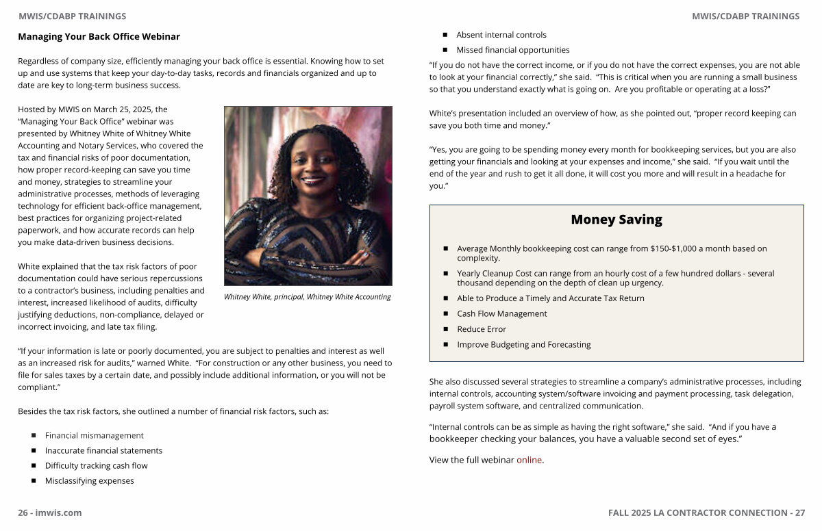 Hosted by MWIS on March 25, 2025, the“ Managing Your Back Office” webinar was presented by Whitney White of Whitney White Accounting and Notary Services, who covered the tax and financial risks of poor documentation, how proper record-keeping can save you time and money, strategies to streamline your administrative processes, methods of leveraging technology for efficient back-office management, best practices for organizing project-related paperwork, and how accurate records can help you make data-driven business decisions.