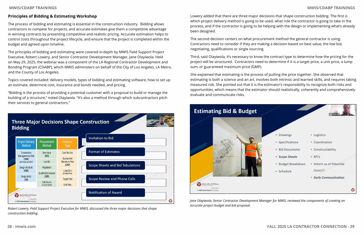 The principles of bidding and estimating were covered in-depth by MWIS Field Support Project Executive, Robert Lowery, and Senior Contractor Development Manager, Jane Olayiwola. Held on May 29, 2025, the webinar was a component of the LA Regional Contractor Development and Bonding Program( CDABP), which MWIS administers on behalf of the City of Los Angeles, LA Metro, and the County of Los Angeles.