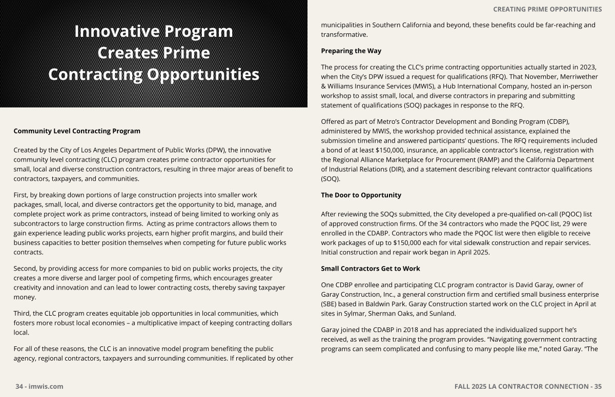 The process for creating the CLC’ s prime contracting opportunities actually started in 2023, when the City’ s DPW issued a request for qualifications( RFQ). That November, Merriwether & Williams Insurance Services( MWIS), a Hub International Company, hosted an in-person workshop to assist small, local, and diverse contractors in preparing and submitting statement of qualifications( SOQ) packages in response to the RFQ.