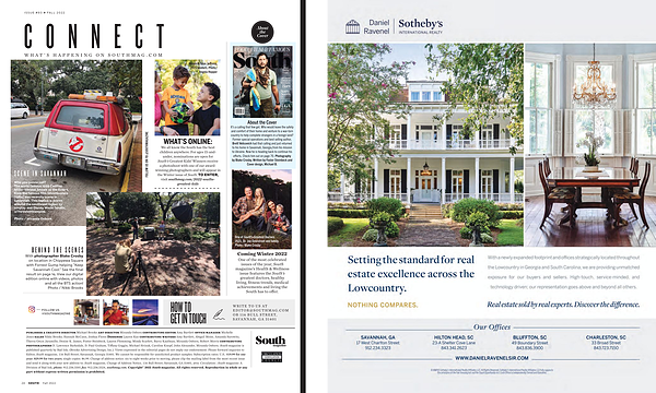 publisher & creative director Michael Brooks art director Miranda Osborn contributing editor Amy Bartlett office manager Michelle Jones sales Nikki Brooks , Hannah McCann , Joshua Flores Designer Lauren Kuo contributing writers Amy Bartlett , Abigail Moise , Amanda Surowitz , Therra Gwyn Jaramillo , Denise K . James , Foster Steinbeck , Lauren Flemming , Mindy Scarlett , Barry Kaufman , Miranda Osborn , Robert Morris contributing photographers D . Lawrence Barksdale , D . Paul Graham , Tiffany Goggin , Michael Hrizuk , Caroline Knopf , John Alexander , Miranda Osborn . South magazine is published quarterly by Bad Ink , ( Brooks Advertising Design , Inc .). Views expressed in the editorial pages do not imply our endorsement . Please forward inquiries to Editor , South magazine , 116 Bull Street , Savannah , Georgia 31401 . We cannot be responsible for unsolicited product samples . Subscription rates : U . S .: $ 19.99 for one year ; $ 29.99 for two years ; single copies : $ 6.99 . Change of address notice : six to eight weeks prior to moving , please clip the mailing label from the most recent issue and send it along with your new address to : South magazine , Change of Address Notice , 116 Bull Street , Savannah , GA 31401 , attn : Circulation | South magazine : A Division of Bad Ink , phone : 912.236.5501 fax : 912.236.5524 , southmag . com . Copyright © 2022 South magazine . All rights reserved . Reproduction in whole or any part without express written permission is prohibited .