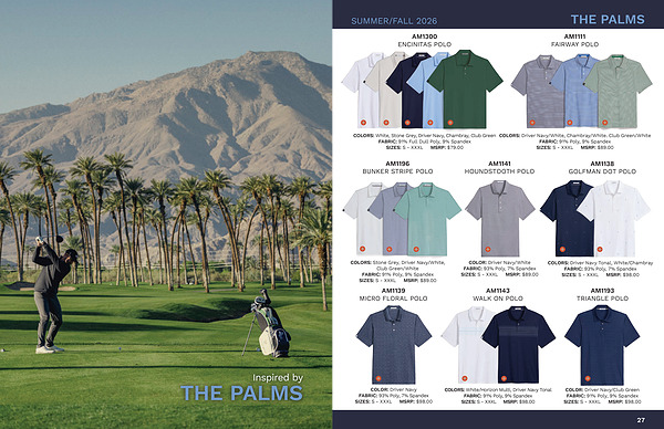 COLORS: White, Stone Grey, Driver Navy, Chambray, Club Green FABRIC: 91 % Full Dull Poly, 9 % Spandex SIZES: S- XXXL MSRP: $ 79.00