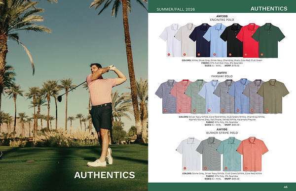 COLORS: White, Stone Grey, Driver Navy, Chambray, Black, Core Red, Club Green FABRIC: 91 % Full Dull Poly, 9 % Spandex SIZES: S- XXXL MSRP: $ 79.00