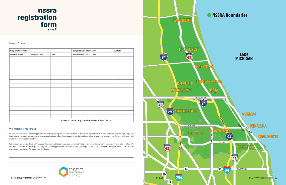 58 14 45 12 94 294 DEMPSTER ST. LAKE-COOK RD. GLENVIEW RIVERWOODS WILMETTE LAKE MICHIGAN NSSRA Boundaries GLENCOE WINNETKA KENILWORTH NORTHBROOK DEERFIELD HIGHLAND PARK HIGHWOOD LAKE FOREST LAKE BLUFF WILLOW RD. LAKE AVE. WAUKEGAN RD. NORTHFIELD SHERIDAN RD. GREEN BAY RD. EDENS EXPWY. TRI-STATE TOLLWAY 94 NSSRA 294 94 94 45 45 41 41 63 Fall 2025( 847) 509-9400 | nssra. org
