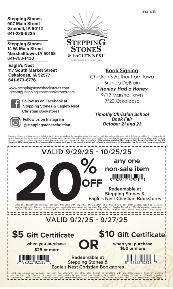 Follow us on Facebook at Stepping Stones & Eagle’ s Nest Christian Bookstores
