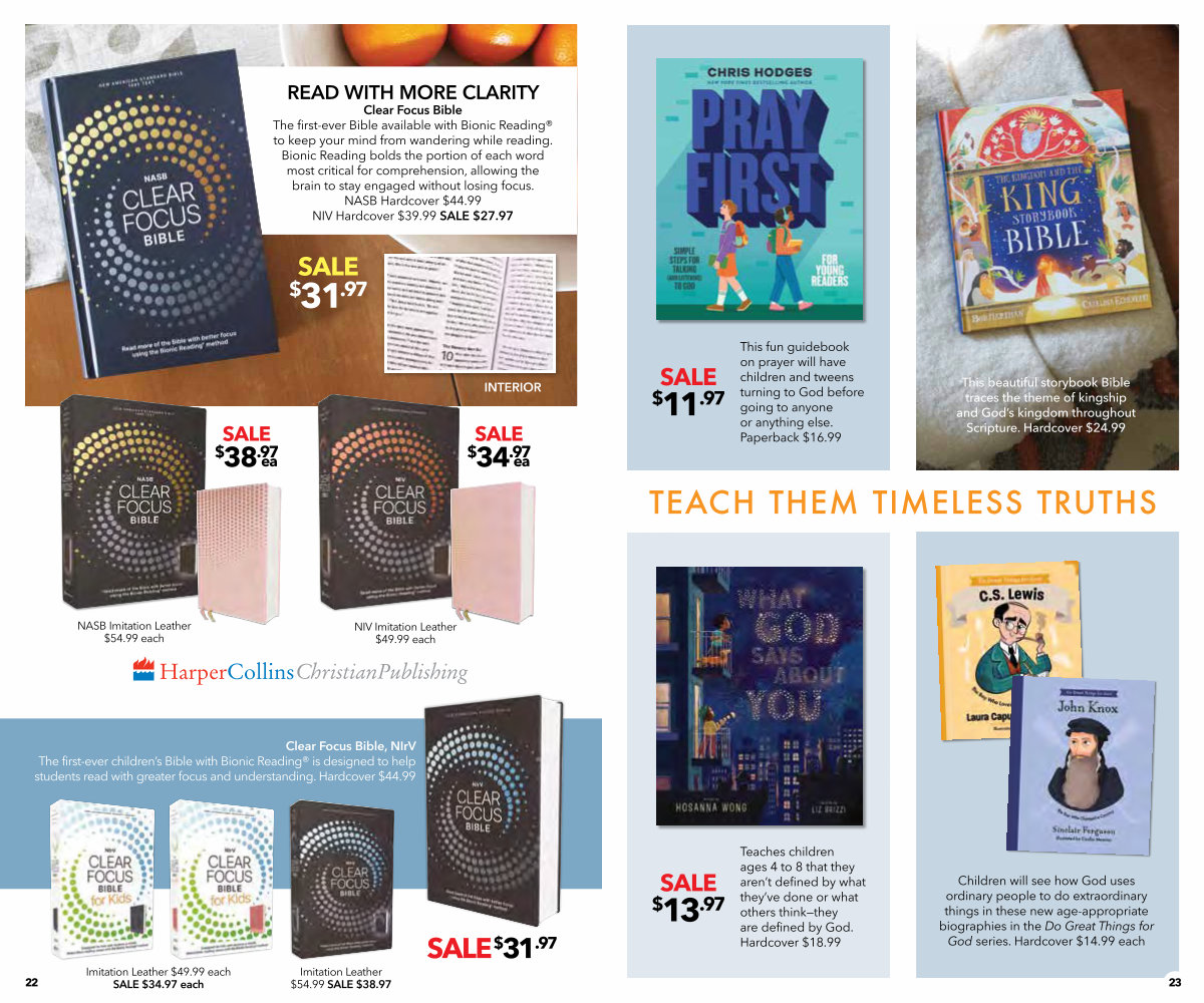 READ WITH MORE CLARITY Clear Focus Bible The first-ever Bible available with Bionic Reading ® to keep your mind from wandering while reading. Bionic Reading bolds the portion of each word most critical for comprehension, allowing the brain to stay engaged without losing focus. NASB Hardcover $ 44.99 NIV Hardcover $ 39.99 SALE $ 27.97
