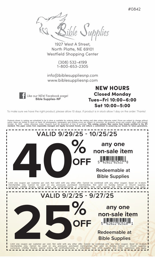 Limit one coupon per customer per visit. Not valid with any other offer. Cannot be combined with any other coupon. Good on in-stock merchandise only. Cannot be used on any previously purchased merchandise. Not valid on Sunday School or Church supplies, curriculum, LifeWay Studies, special orders, gift certificates / cards, or collectibles. Only while supplies last. Other restrictions may apply.