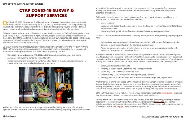 To better understand the impact of COVID-19 on our small contractors , CTAP staff developed and sent out a survey to 35 CTAP participants in April 2020 and , despite the intense chaos and confusion of those early days of the pandemic , the survey received a nearly 50 % response rate . Based on the survey responses , CTAP staff expanded the Program ’ s focus and services to help address the most urgent needs of our small contractor community .