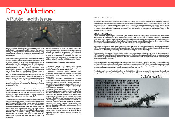 Stress: American Psychological Association (APA) defines stress as, "The pattern of specific and nonspecific responses of an organism that tax or exceed his ability to cope". In response to stressors, physiological changes occur in the body that lead to psychological changes and person feels to be under stressed and could not cope with the stressors. Sometimes, he finds the solutions of his problems in useless things and get involved in the addictive behavior. He uses different kinds of drugs just to feel relax and to escape from reality.