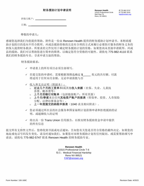 感谢您选择我们为您提供帮助 。 附件是一份由 Renown Health 提供的财务援助计划申请书 。 本财政援 助计划的目的是向不符合联邦 、 州或县援助资格的且没有合理的方式来履行必要医疗服务的财务义务的 担保人提供财务救济 。 所要求的文件仅用于确定财务援助计划的资格 。 如果您尚未直接申请联邦 、 州或 县的援助, 我们可以帮助您进行简单的筛查, 以确定您符合资格的可能性 。 请致电 775-982-4110 联系 我们的财务援助专员, 寻求申请方面的帮助 。