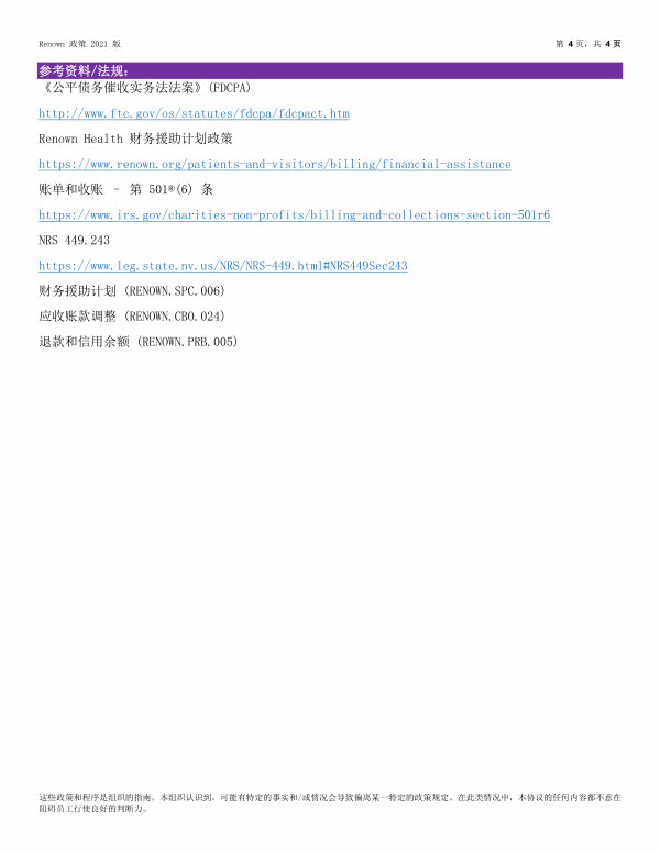 http:// www. ftc. gov / os / statutes / fdcpa / fdcpact. htm Renown Health 财务援助计划政策 https:// www. renown. org / patients-and-visitors / billing / financial-assistance 账单和收账 – 第 501 ®( 6) 条 https:// www. irs. gov / charities-non-profits / billing-and-collections-section-501r6 NRS 449.243 https:// www. leg. state. nv. us / NRS / NRS-449. html # NRS449Sec243 财务援助计划( RENOWN. SPC. 006) 应收账款调整( RENOWN. CBO. 024) 退款和信用余额( RENOWN. PRB. 005)