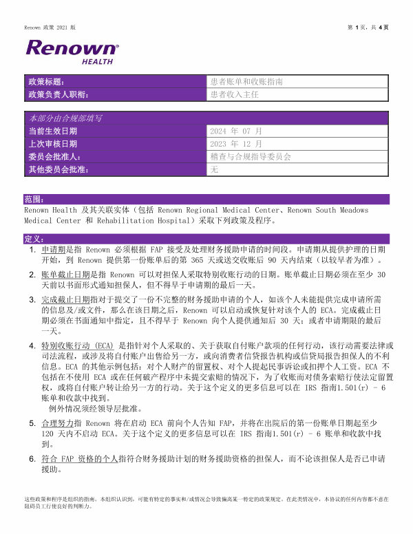 5. 合理努力指 Renown 将在启动 ECA 前向个人告知 FAP, 并将在出院后的第一份账单日期起至少 120 天内不启动 ECA 。 关于这个定义的更多信息可以在 IRS 指南 1.501( r)- 6 账单和收款中找 到 。