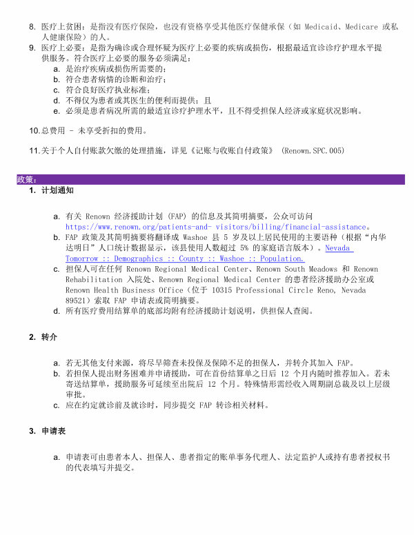 a. 有关 Renown 经济援助计划( FAP) 的信息及其简明摘要, 公众可访问 https:// www. renown. org / patients-and- visitors / billing / financial-assistance 。 b. FAP 政策及其简明摘要将翻译成 Washoe 县 5 岁及以上居民使用的主要语种( 根据“ 内华 达明日” 人口统计数据显示, 该县使用人数超过 5 % 的家庭语言版本) 。 Nevada Tomorrow:: Demographics:: County:: Washoe:: Population. c. 担保人可在任何 Renown Regional Medical Center 、 Renown South Meadows 和 Renown Rehabilitation 入院处 、 Renown Regional Medical Center 的患者经济援助办公室或 Renown Health Business Office( 位于 10315 Professional Circle Reno, Nevada 89521) 索取 FAP 申请表或简明摘要 。 d. 所有医疗费用结算单的底部均附有经济援助计划说明, 供担保人查阅 。