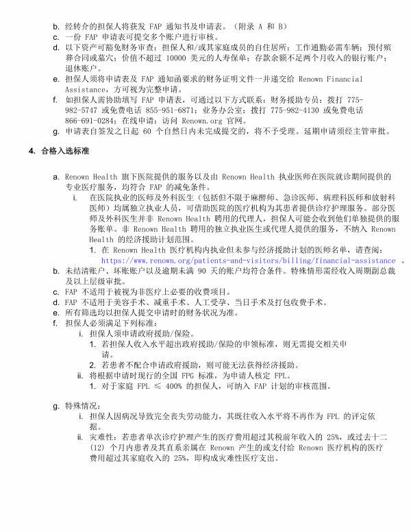 b. 经转介的担保人将获发 FAP 通知书及申请表 。( 附录 A 和 B) c. 一份 FAP 申请表可提交多个账户进行审核 。 d. 以下资产可豁免财务审查: 担保人和 / 或其家庭成员的自住居所; 工作通勤必需车辆; 预付殡 葬合同或墓穴; 价值不超过 10000 美元的人寿保单; 存款余额不足两个月收入的银行账户; 退休账户 。 e. 担保人须将申请表及 FAP 通知函要求的财务证明文件一并递交给 Renown Financial Assistance, 方可视为完整申请 。 f. 如担保人需协助填写 FAP 申请表, 可通过以下方式联系: 财务援助专员: 拨打 775- 982-5747 或免费电话 855-951-6871; 业务办公室: 拨打 775-982-4130 或免费电话 866-691-0284; 在线申请: 访问 Renown. org 官网 。 g. 申请表自签发之日起 60 个自然日内未完成提交的, 将不予受理 。 延期申请须经主管审批 。