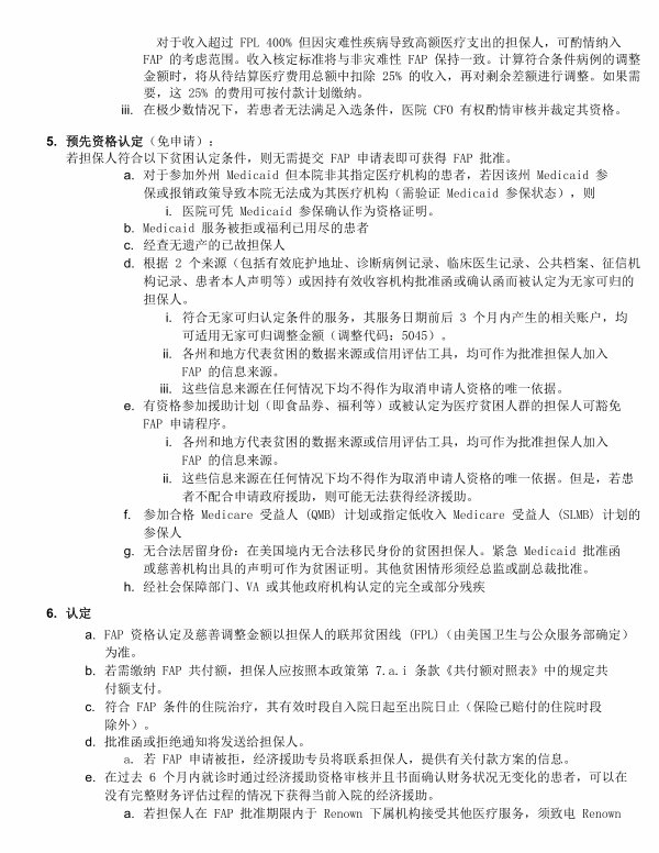 没有完整财务评估过程的情况下获得当前入院的经济援助 。 a. 若担保人在 FAP 批准期限内于 Renown 下属机构接受其他医疗服务, 须致电 Renown