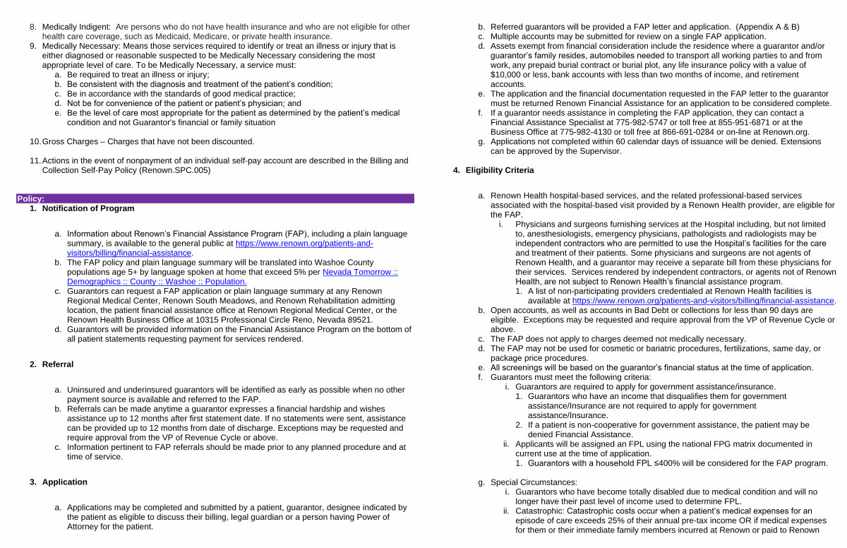 a. Information about Renown’ s Financial Assistance Program( FAP), including a plain language summary, is available to the general public at https:// www. renown. org / patients-andvisitors / billing / financial-assistance. b. The FAP policy and plain language summary will be translated into Washoe County populations age 5 + by language spoken at home that exceed 5 % per Nevada Tomorrow:: Demographics:: County:: Washoe:: Population. c. Guarantors can request a FAP application or plain language summary at any Renown Regional Medical Center, Renown South Meadows, and Renown Rehabilitation admitting location, the patient financial assistance office at Renown Regional Medical Center, or the Renown Health Business Office at 10315 Professional Circle Reno, Nevada 89521. d. Guarantors will be provided information on the Financial Assistance Program on the bottom of all patient statements requesting payment for services rendered.