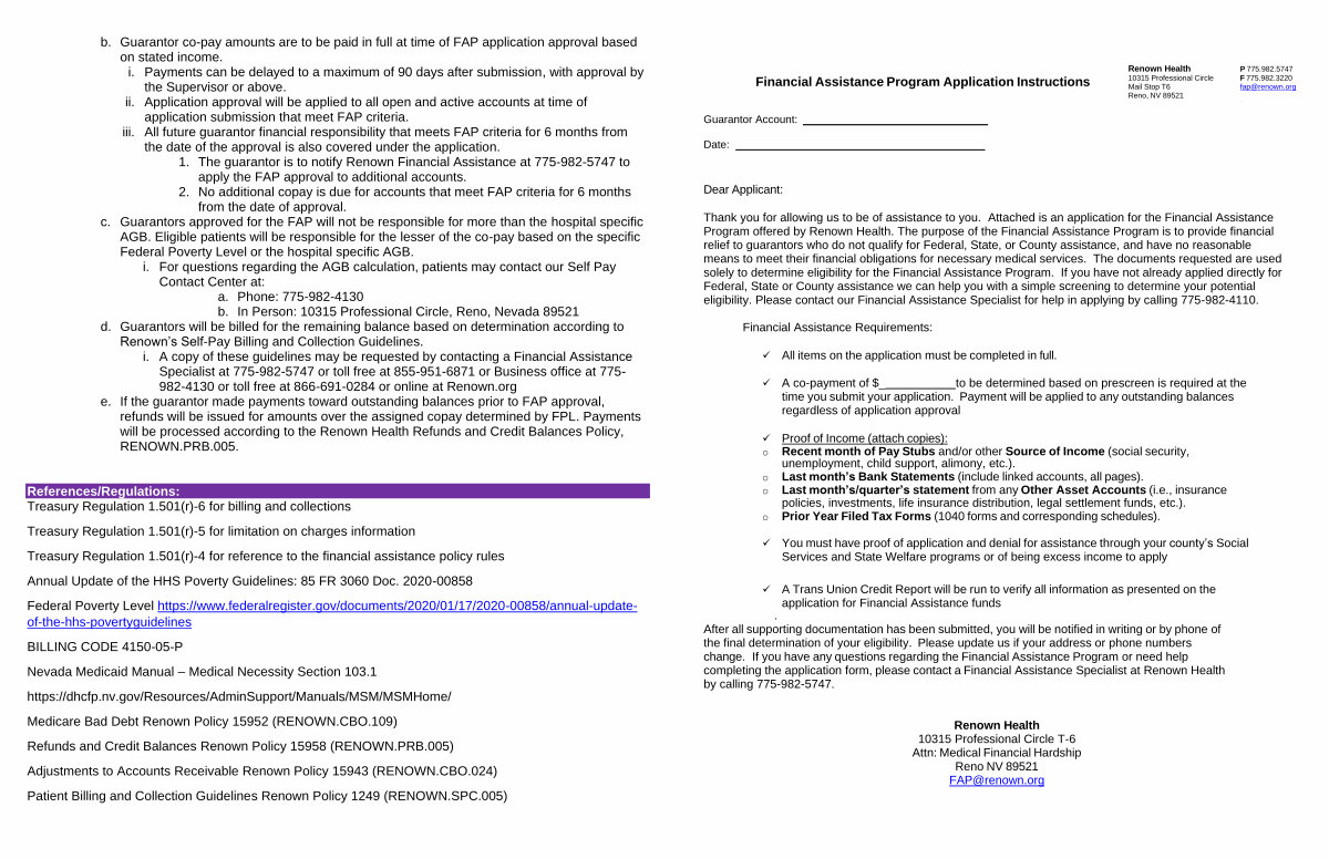 Contact Center at: a. Phone: 775-982-4130 b. In Person: 10315 Professional Circle, Reno, Nevada 89521 d. Guarantors will be billed for the remaining balance based on determination according to Renown’ s Self-Pay Billing and Collection Guidelines. i. A copy of these guidelines may be requested by contacting a Financial Assistance Specialist at 775-982-5747 or toll free at 855-951-6871 or Business office at 775- 982-4130 or toll free at 866-691-0284 or online at Renown. org e. If the guarantor made payments toward outstanding balances prior to FAP approval, refunds will be issued for amounts over the assigned copay determined by FPL. Payments will be processed according to the Renown Health Refunds and Credit Balances Policy, RENOWN. PRB. 005.