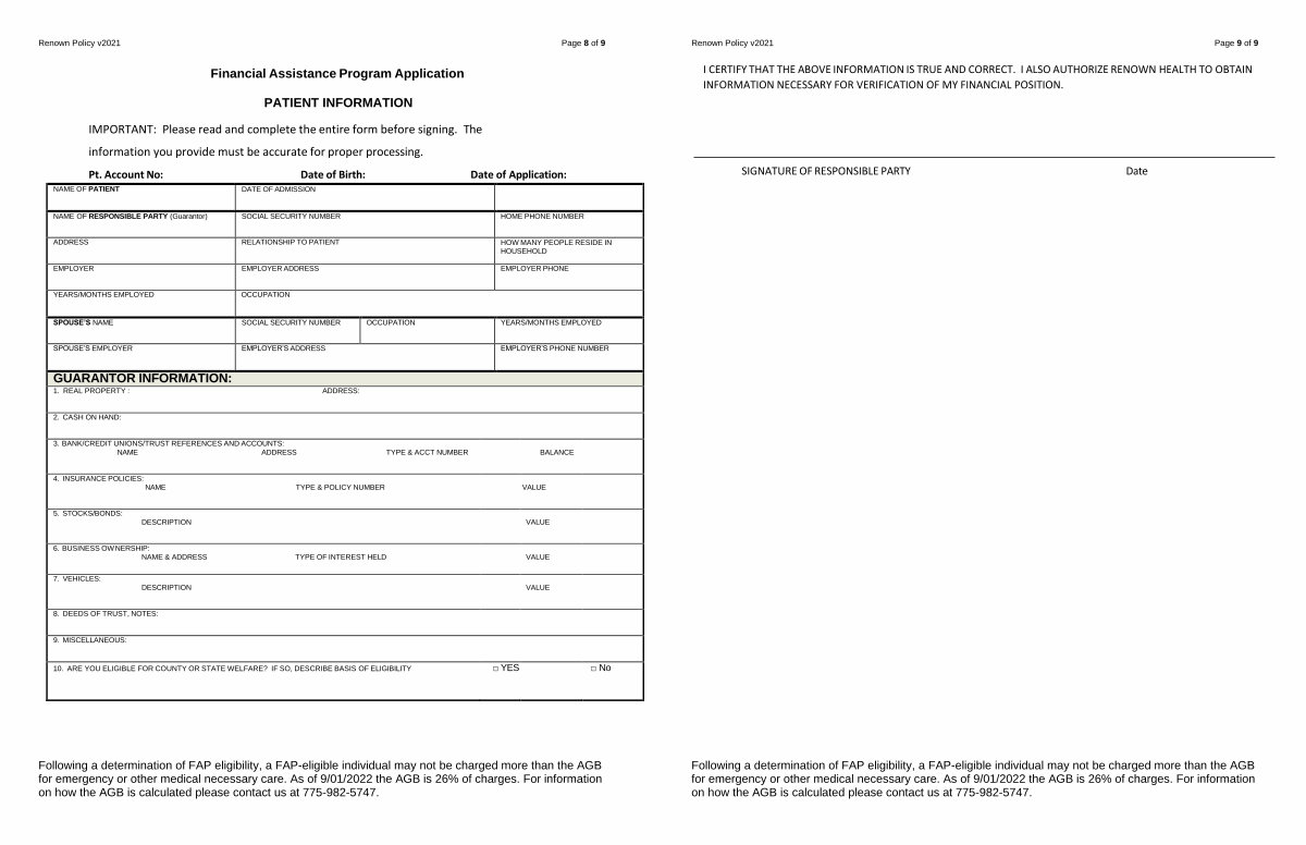 Following a determination of FAP eligibility, a FAP-eligible individual may not be charged more than the AGB for emergency or other medical necessary care. As of 9 / 01 / 2022 the AGB is 26 % of charges. For information on how the AGB is calculated please contact us at 775-982-5747.