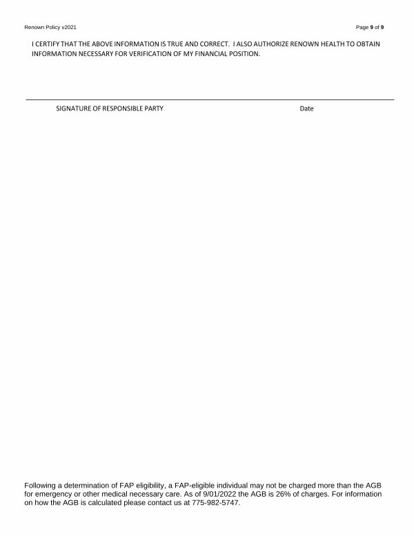 I CERTIFY THAT THE ABOVE INFORMATION IS TRUE AND CORRECT. I ALSO AUTHORIZE RENOWN HEALTH TO OBTAIN INFORMATION NECESSARY FOR VERIFICATION OF MY FINANCIAL POSITION.