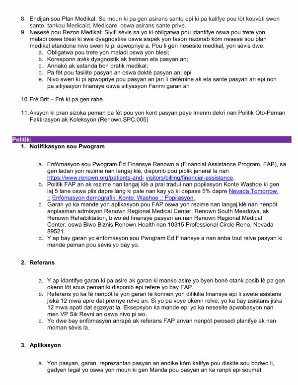 a. Enfòmasyon sou Pwogram Èd Finansye Renown a( Financial Assistance Program, FAP), sa gen ladan yon rezime nan langaj klè, disponib pou piblik jeneral la nan https:// www. renown. org / patients-and- visitors / billing / financial-assistance. b. Politik FAP an ak rezime nan langaj klè a pral tradui nan popilasyon Konte Washoe ki gen laj 5 lane oswa plis dapre lang ki pale nan kay yo ki depase 5 % dapre Nevada Tomorrow:: Enfòmasyon demografik: Konte: Washoe:: Popilasyon. c. Garan yo ka mande yon aplikasyon pou FAP oswa yon rezime nan langaj klè nan nenpòt anplasman admisyon Renown Regional Medical Center, Renown South Meadows, ak Renown Rehabilitation, biwo èd finansye pasyan an nan Renown Regional Medical Center, oswa Biwo Biznis Renown Health nan 10315 Professional Circle Reno, Nevada 89521. d. Y ap bay garan yo enfòmasyon sou Pwogram Èd Finansye a nan anba tout relve pasyan ki mande peman pou sèvis yo bay yo.