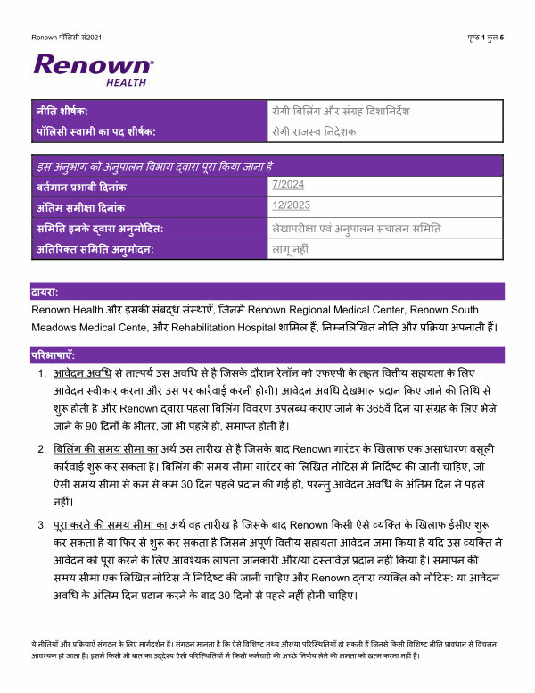1. आवेदन अव�ध से तात्पयर् उस अव�ध से है िजसके दौरान रेनॉन को एफएपी के तहत �व�ीय सहायता के �लए आवेदन स्वीकार करना और उस पर कारर्वाई करनी होगी । आवेदन अव�ध देखभाल प्रदान �कए जाने क� �त�थ से शुरू होती है और Renown द्वारा पहला �ब�लंग �ववरण उपलब्ध कराए जाने के 365वें �दन या संग्रह के �लए भेजे जाने के 90 �दनों के भीतर, जो भी पहले हो, समाप्त होती है ।