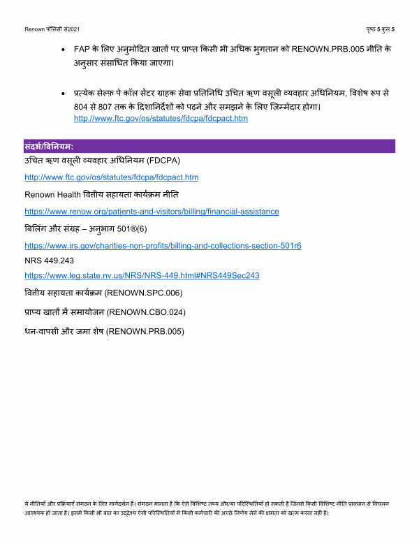 http:// www. ftc. gov / os / statutes / fdcpa / fdcpact. htm Renown Health �व�ीय सहायता कायर्क्रम नी�त https:// www. renow. org / patients-and-visitors / billing / financial-assistance �ब�लंग और संग्रह – अनुभाग 501 ®( 6) https:// www. irs. gov / charities-non-profits / billing-and-collections-section-501r6 NRS 449.243 https:// www. leg. state. nv. us / NRS / NRS-449. html # NRS449Sec243 �व�ीय सहायता कायर्क्रम( RENOWN. SPC. 006) प्राप्य खातों में समायोजन( RENOWN. CBO. 024) धन-वापसी और जमा शेष( RENOWN. PRB. 005)