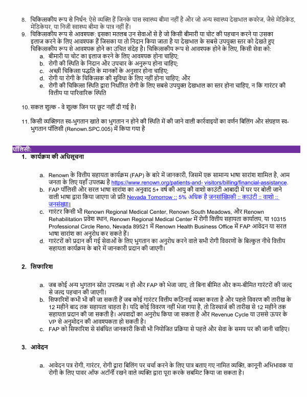 a. Renown के िव�ीय सहायता कायर्क्रम( FAP) के बारे में जानकारी, िजसमें एक सामा� भाषा सारांश शािमल है, आम जनता के िलए यहाँ उपल� है https:// www. renown. org / patients-and- visitors / billing / financial-assistance. b. FAP पॉिलसी और सरल भाषा सारांश का अनुवाद 5 + वषर् की आयु की वाशो काउं टी आबादी में घर पर बोली जाने वाली भाषा द्वारा िकया जाएगा जो प्रित Nevada Tomorrow:: 5 % अिधक है जनसां��की:: काउं टी:: वाशो:: जनसं�ा । c. गारं टर िकसी भी Renown Regional Medical Center, Renown South Meadows, और Renown Rehabilitation प्रवेश स्थान, Renown Regional Medical Center में रोगी िव�ीय सहायता कायार्लय, या 10315 Professional Circle Reno, Nevada 89521 में Renown Health Business Office में FAP आवेदन या सरल भाषा सारांश का अनुरोध कर सकते हैं । d. गारं टरों को प्रदान की गई सेवाओं के िलए भुगतान का अनुरोध करने वाले सभी रोगी िववरणों के ि ब ल्कु ल नीचे िव�ीय सहायता कायर्क्रम के बारे में जानकारी प्रदान की जाएगी ।