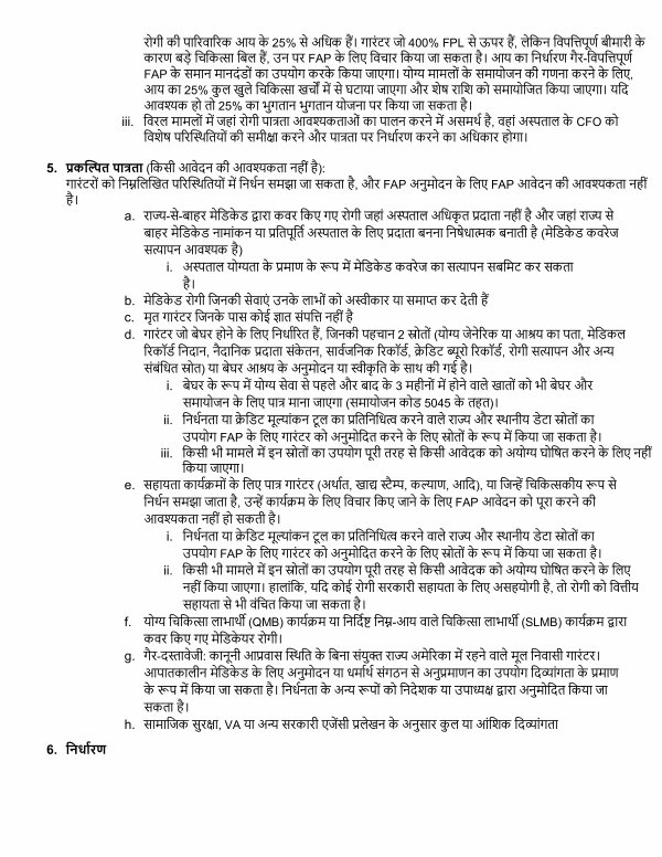 5. प्रक��त पात्रता( िकसी आवेदन की आव�कता नहीं है): गारं टरों को िन�िल�खत प�र�स्थितयों में िनधर्न समझा जा सकता है, और FAP अनुमोदन के िलए FAP आवेदन की आव�कता नहीं है । a. र ा ज्य-से-बाहर म े ि ड के ड द्वारा कवर िकए गए रोगी जहां अ�ताल अ ि ध कृ त प्रदाता नहीं है और जहां रा� से बाहर मेि ड के ड नामांकन या प्रितपूितर् अ�ताल के िलए प्रदाता बनना िनषेधा�क बनाती है( मेिडके ड कवरे ज स�ापन आव�क है) i. अ�ताल यो�ता के प्रमाण के रूप में म े ि ड के ड कवरे ज का स�ापन सबिमट कर सकता