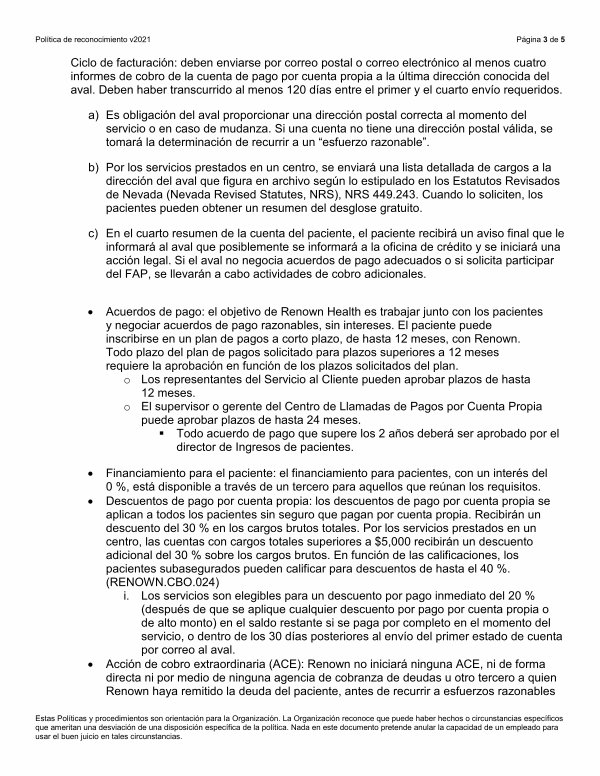 • Acción de cobro extraordinaria( ACE): Renown no iniciará ninguna ACE, ni de forma directa ni por medio de ninguna agencia de cobranza de deudas u otro tercero a quien Renown haya remitido la deuda del paciente, antes de recurrir a esfuerzos razonables