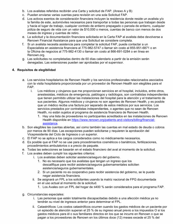 b. Los avalistas referidos recibirán una Carta y solicitud de FAP.( Anexo A y B) c. Pueden enviarse varias cuentas para revisión en una sola Solicitud FAP. d. Los activos exentos de consideración financiera incluyen la residencia donde reside un avalista y / o la familia de este, automóviles necesarios para transportar a todas las personas que trabajan desde y hacia el lugar de trabajo, cualquier contrato de entierro prepagado o parcela de entierro, cualquier póliza de seguro de vida con un valor de $ 10,000 o menos, cuentas de banco con menos de dos meses de ingreso y cuentas de retiro. e. La solicitud y la documentación financiera solicitada en la Carta FAP al avalista debe devolverse a Renown Financial Assistance para que una Solicitud se considere completa. f. Si un avalista necesita asistencia para completar la solicitud FAP, puede contactar a un Especialista en asistencia financiera al 775-982-5747 o llamar sin costo al 855-951-6871 o en la Oficina de negocios al 775-982-4130 o llamar sin costo al 866-691-0284 o en línea en Renown. org. g. Las solicitudes no completadas dentro de 60 días calendario a partir de la emisión serán denegadas. Las extensiones pueden ser aprobadas por el supervisor.