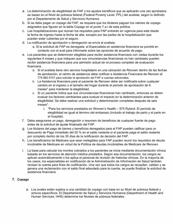 a. La determinación de elegibilidad de FAP y los ajustes benéficos que se aplicarán una vez aprobados se basan en el Nivel de pobreza federal( Federal Poverty Level, FPL) del avalista, según lo definido por el Departamento de Salud y Servicios Humanos. b. Si se debe pagar un copago del FAP, se requiere que los titulares paguen los valores de copago asignados que figuran en la tabla Copago en el punto 7. a. i de esta política. c. Las hospitalizaciones que reúnan los requisitos para FAP entrarán en vigencia para este desde la fecha de ingreso hasta la fecha de alta, excepto por las partes de la hospitalización que puedan estar cubiertas por el seguro. d. La notificación de aprobación o denegación se envía al avalista. a. Si la solicitud de FAP es denegada, el Especialista en asistencia financiera se pondrá en contacto con el aval para informarle sobre las opciones de acuerdo de pago. e. Los pacientes que se determinen elegibles para recibir asistencia financiera con visitas durante los siguientes 6 meses y que indiquen que sus circunstancias financieras no han cambiado pueden recibir asistencia financiera para una admisión actual sin el proceso completo de evaluación financiera. a. Si el avalista tiene otro servicio hospitalario en una ubicación de Renown dentro de las fechas de aprobación, el centro de asistencia debe notificar a Asistencia Financiera de Renown al 775-982-5747 para solicitar la aprobación del FAP a cuentas adicionales. b. La Asistencia financiera para el paciente de Renown debe ser notificada sobre cualquier cambio en el ingreso o el tamaño del hogar durante el periodo de aprobación de 6 meses * para mantener la elegibilidad. c. Si un paciente indica que sus circunstancias financieras han cambiado, entonces se deben evaluar los factores cambiantes para evaluar el impacto en la determinación anterior de elegibilidad. Se debe realizar una solicitud y determinación completas después de seis meses *. i. * Para los servicios prestados en Women’ s Health – 975 Ryland: El período de elegibilidad es igual al término del embarazo( incluido el trabajo de parto y el parto en el hospital). f. Debe asegurarse un pago, denegación o resumen de beneficios de cualquier fuente de pago antes de la solicitud de ajuste finalizado del FAP. g. Los titulares del pago de bienes y beneficios denegados para el FAP pueden calificar para un descuento de Pago inmediato del 20 % en el saldo restante si el paciente paga el saldo restante por completo dentro de los 30 días de la notificación de decisión del FAP. h. Los beneficiarios de Medicare que sean inelegibles para FAP pueden reunir los requisitos de deuda incobrable de Medicare en virtud de la Política de deudas incobrables de Medicare de Renown.
