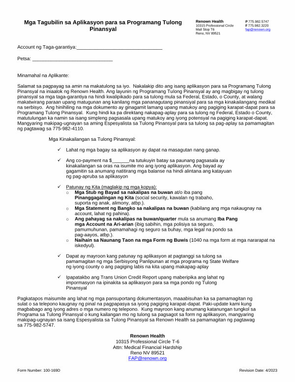 Salamat sa pagpayag sa amin na makatulong sa iyo. Nakalakip dito ang isang aplikasyon para sa Programang Tulong Pinansyal na iniaalok ng Renown Health. Ang layunin ng Programang Tulong Pinansyal ay ang magbigay ng tulong pinansyal sa mga taga-garantiya na hindi kwalipikado para sa tulong mula sa Federal, Estado, o County, at walang makatwirang paraan upang matugunan ang kanilang mga pananagutang pinansiyal para sa mga kinakailangang medikal na serbisyo. Ang hinihiling na mga dokumento ay ginagamit lamang upang matukoy ang pagiging karapat-dapat para sa Programang Tulong Pinansyal. Kung hindi ka pa direktang nakapag-aplay para sa tulong ng Federal, Estado o County, matutulungan ka namin sa isang simpleng pagsasala upang matukoy ang iyong potensyal na pagiging karapat-dapat. Mangyaring makipag-ugnayan sa aming Espesyalista sa Tulong Pinansyal para sa tulong sa pag-aplay sa pamamagitan ng pagtawag sa 775-982-4110.