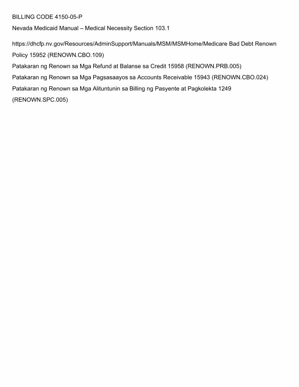 https:// dhcfp. nv. gov / Resources / AdminSupport / Manuals / MSM / MSMHome / Medicare Bad Debt Renown Policy 15952( RENOWN. CBO. 109) Patakaran ng Renown sa Mga Refund at Balanse sa Credit 15958( RENOWN. PRB. 005) Patakaran ng Renown sa Mga Pagsasaayos sa Accounts Receivable 15943( RENOWN. CBO. 024) Patakaran ng Renown sa Mga Alituntunin sa Billing ng Pasyente at Pagkolekta 1249( RENOWN. SPC. 005)