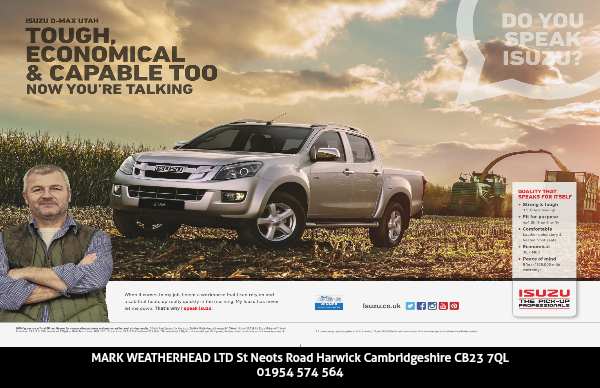 DO YOU SPEAK ISUZU? ISUZU D-MAX UTAH TOUGH, ECONOMICAL & CAPABLE TOO NOW YOU’RE TALKING QUALITY THAT SPEAKS FOR ITSELF • Strong & tough 3.5 Tonne towing* • Fit for purpose 4x4 Shift-on-the-fly • Comfortable Leather upholstery & heated front seats • Economical 38.7 MPG • Peace of mind 5 Year/125,000 mile warranty** When it comes to my job, I need a workhorse that I can rely on and a cab that heats up really quickly in the morning. My Isuzu has never let me down. That’s why I speak Isuzu. MPG figures are official EU test figures for comparative purposes and may not reflect real driving results. Official fuel figures for the Isuzu D-MAX Utah Manual in mpg (l/100km): Urban 31.7 (8.9). Extra Urban 44.1 (6.4). Combined 38.7 (7.3). CO2 emissions 192g/km. Utah Auto: Urban 28.0 (10.1). Extra Urban 38.7 (7.3). Combined 33.6 (8.4). CO2 emissions 220g/km. For model specific figures please contact us directly or visit www.isuzu.co.uk Isuzu.co.uk *3.5 tonne towing capacity applies to all 4x4 models. **5 year/125,000 mile (whichever comes first) warranty applies to all new Isuzu D-Max models.