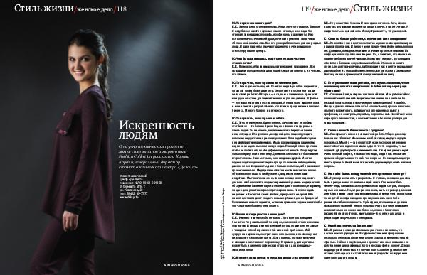FC: С кем вы больше работаете, с мужчинами или с женщинами? К. К.: Коллектив у нас в центре состоит из мужчин и женщин примерно в равной пропорции. И лично у меня предпочтений относительно пола нет. Для меня, прежде всего имеет значение профессионализм. И в каждом, из наших докторов я уверена. Но, я заметила, что многие из пациентов боятся врачей-мужчин. Возможно, считают, что женщина относится с большим сочувствием и заботой. Обо всех говорить сложно, но доктора-мужчины, работающие у нас в центре вкладывают душу в работу и с большой ответственностью относятся к своему делу. Поэтому, лично я преимуществ женщин-врачей не вижу. интервью | Любовь Кривозубова фото | Михаил Смоленцев || макияж, волосы | Елена Киаро