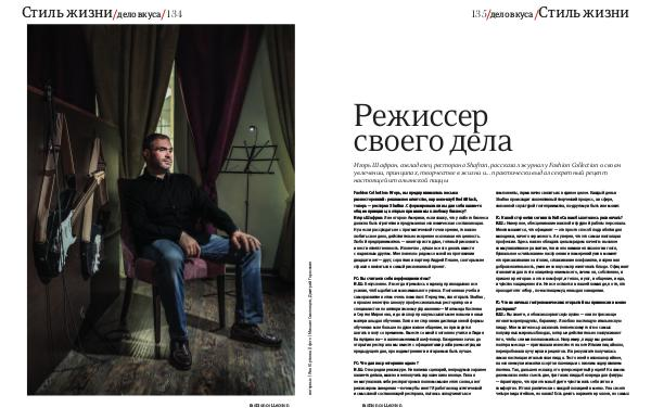 FC: Что для вас ресторанное дело? И. Ш.: Оно сродни режиссуре. Не написав сценарий, не продумав заранее какие-то детали, можно и не получить хорошее кино в конце. Пока я не могу назвать себя ресторатором в полном смысле этого слова, а вот режиссером заведения— почему бы и нет? Я работаю над эстетической и смысловой составляющей ресторана, пытаюсь соподчинить все компоненты, гармонично связать их в единое целое. Каждый день в Shafran происходит коллективный творческий процесс, а в сфере, связанной с культурой гостеприимства, по-другому и быть и не может.