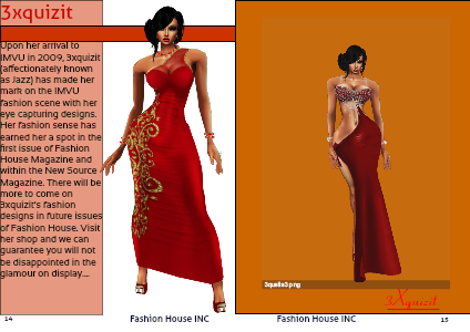 Upon her arrival to IMVU in 2009, 3xquizit (affectionately known as Jazz) has made her mark on the IMVU fashion scene with her eye capturing designs. Her fashion sense has earned her a spot in the first issue of Fashion House Magazine and within the New Source Magazine. There will be more to come on 3xquizit’s fashion designs in future issues of Fashion House. Visit her shop and we can guarantee you will not be disappointed in the glamour on display….