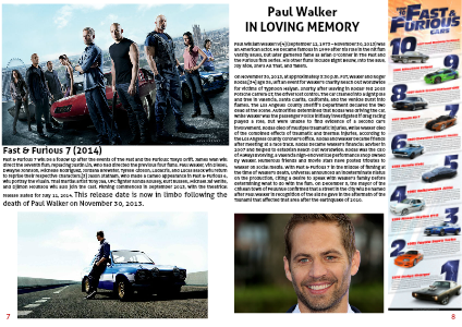 Fast & Furious 7 will be a follow up after the events of The Fast and the Furious: Tokyo Drift. James Wan will direct the seventh film, replacing Justin Lin, who had directed the previous four films. Paul Walker, Vin Diesel, Dwayne Johnson, Michelle Rodriguez, Jordana Brewster, Tyrese Gibson, Ludacris, and Lucas Black will return to reprise their respective characters.[3] Jason Statham, who made a cameo appearance in Fast & Furious 6, will portray the villain. Thai martial artist Tony Jaa, UFC fighter Ronda Rousey, Kurt Russell, Michael Jai White, and Djimon Hounsou will also join the cast. Filming commenced in September 2013, with the theatrical release slated for July 11, 2014. This release date is now in limbo following the death of Paul Walker on November 30, 2013.