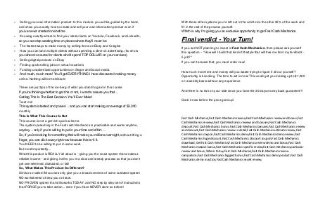 These are just tips of the ice-berg of what you stand to gain in this course If you’ re thinking whether to get this or not, I want to assure you that … Getting This Is The Best Decision You’ ll Ever Make! Trust me! This system is tested and proven … and you can start making an average of $ 3,000 monthly This Is What This Course Is Not This course is not a get-rich-quick scheme. The system preaching in the Fast cash Mechanics is practicable and works anytime, anyday … only if you’ re willing to put in your time and effort …. So, if you’ re looking for something that will make you millions overnight, without lifting a finger, you can click away right now because this isn’ t it. You NEED to be willing to put in some work. But most importantly... What this product is REALLY all about is- giving you the exact system that creates a reliable income- and giving it all to you in a slow and steady process so that you don ' t get overwhelmed, distracted, or fail! So, What Makes This Product So Different? Similar so-called IM courses only give you a broad overview of some outdated system NO worksheets to keep you on track. NO PROVEN system that stills works TODAY, and NO step by step set of instructions that FORCE you to take action... even if you have NEVER done so before!