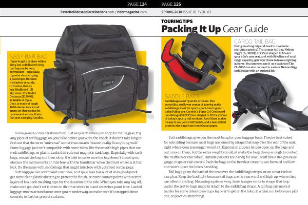 Soft saddlebags give you the most bang for your luggage buck . They ’ re best suited for solo riding because most bags are joined by straps that loop over the rear of the seat , right where your passenger would sit . Expansion zippers let you open up the bags and put more in them , but the extra weight shouldn ' t make the bags droop enough to contact the mufflers or rear wheel . Outside pockets are handy for small stuff like a tire-pressure gauge , maps or rain covers . Pack the bags so the heaviest contents are forward and low and won ’ t upset the bike ’ s handling .
