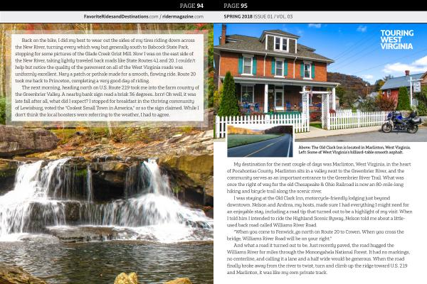 I was staying at the Old Clark Inn , motorcycle-friendly lodging just beyond downtown . Nelson and Andrea , my hosts , made sure I had everything I might need for an enjoyable stay , including a road tip that turned out to be a highlight of my visit . When I told him I intended to ride the Highland Scenic Byway , Nelson told me about a littleused back road called Williams River Road .