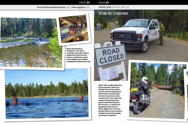 Above : We smelled smoke but had no idea the 1,000-acre Vinegar Fire was burning in the area until we popped out of the trees and came upon this U . S . Forest Service fire security truck . Our route was supposed to go down that gravel road in the distance , but we were re-routed onto pavement to the town of Ukiah . Right : One of several massive fallen trees we had to navigate around since going over wasn ’ t an option !