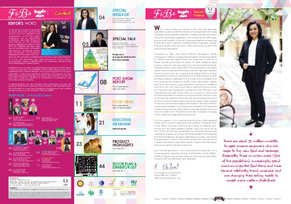 In digital platform, we also introduce new technology to make this event as " SMART Event " for the first time in Thailand. We would like to use this F & B insight as a pre show guidelines to prepare your visit. Looking forward to see you our Fi Asia 2017. SEE YOU THERE!