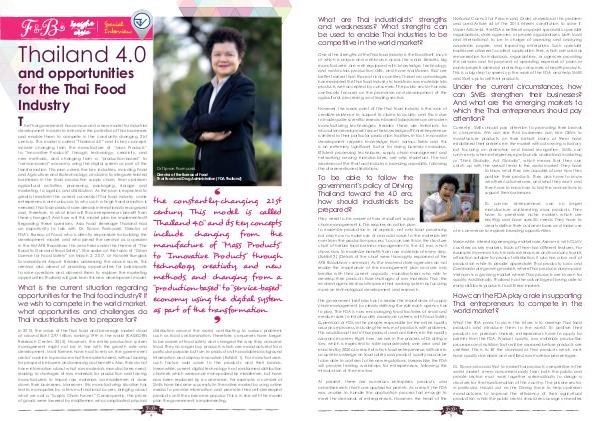 T he Thai government has announced a new model for industrial development in order to enhance the potential of Thai businesses and enable them to compete in the constantly-changing 21st century. This model is called“ Thailand 4.0” and its key concepts include changing from the manufacture of“ Mass Products” to“ Innovative Products” through technology, creativity, and new methods, and changing from a“ production-based” to“ service-based” economy using the digital system as part of the transformation. This plan covers five key industries, including Food and Agriculture and Biotechnology, and aims to integrate related businesses in the food production supply chain, from upstream agricultural activities, processing, packaging, storage and marketing, to logistics and distribution. As the plan is expected to greatly transform the current successful Thai food industry, some entrepreneurs are curious as to why such a huge transformation is needed. Thai food products are already internationally recognized and, therefore, to what level will Thai entrepreneurs benefit from these changes? And how will this model plan be implemented? Regarding these questions, Asia Food Beverage Thailand had an opportunity to talk with Dr. Tipvon Parinyasiri, Director of FDA’ s Bureau of Food, who is directly responsible for building the development model, and who joined the seminar as a speaker in the first AFB Roadshow this year held under the theme of“ The Road to Standard Food Safety”. She spoke on the topic of“ Driver License for Food Safety” on March 2, 2017, at Novotel Bangkok Suvarnabhumi Airport. Besides addressing the above issues, this seminar also aimed at providing opportunities for participants to raise questions and allowed them to explore the marketing opportunities Thailand will gain from this new development model.