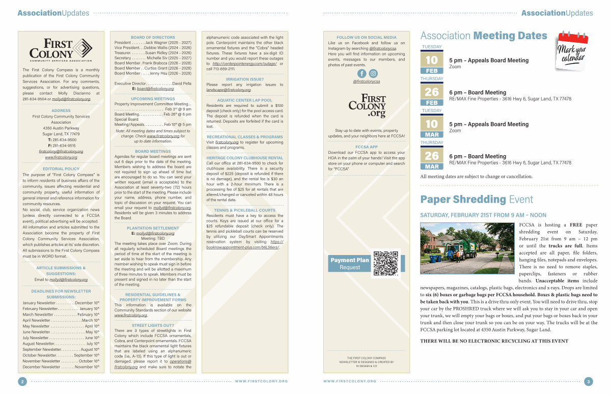 The First Colony Compass is a monthly publication of the First Colony Community Services Association. For any comments, suggestions, or for advertising questions, please contact Molly Discianno at 281-634-9504 or mollyd @ firstcolony. org.