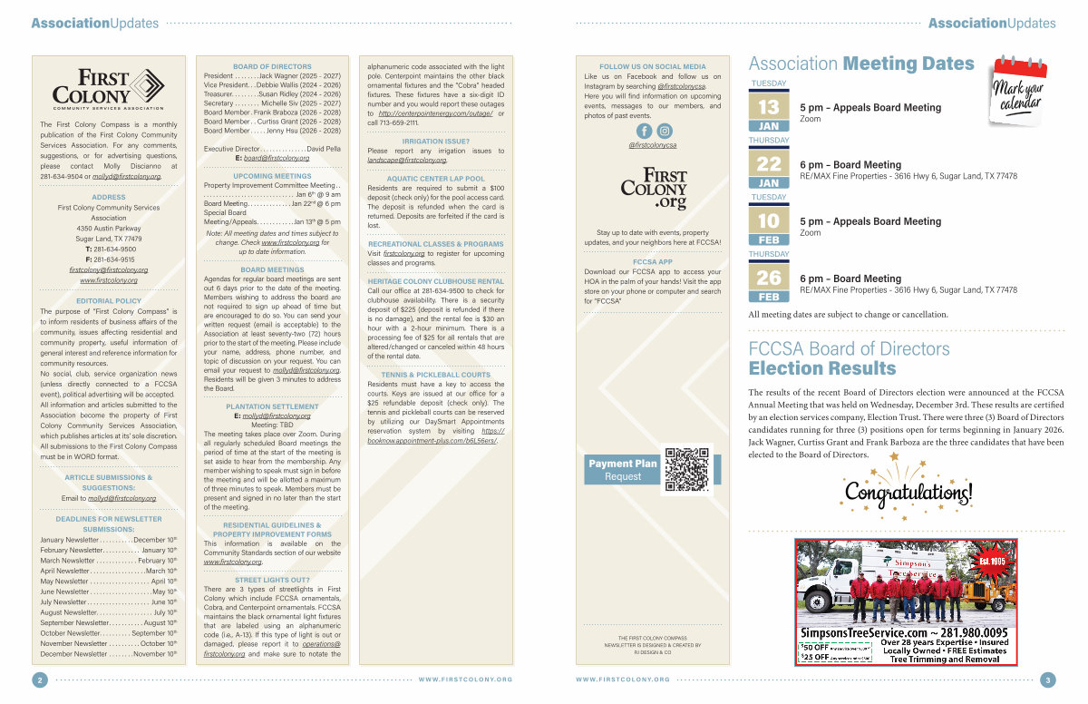 The First Colony Compass is a monthly publication of the First Colony Community Services Association. For any comments, suggestions, or for advertising questions, please contact Molly Discianno at 281-634-9504 or mollyd @ firstcolony. org.